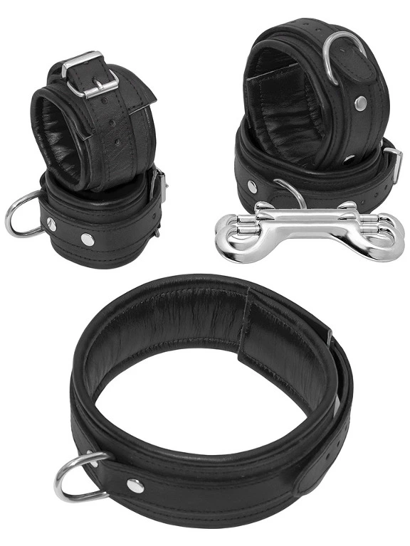 La bonne nouvelle, c’est que vous aurez tout les accessoires n?cessaires ? restreindre les mouvements de la personne soumise pendant vos sessions. Les menottes s’attachent entre elles gr?ce au mousqueton en inox. Les menottes et le collier sont faits en cuir v?ritable rembourr? et ? bouts ronds pour qu’aucune blessure n’arrive ? cause des menottes et qu’elles restent confortablement en place, gr?ce au double rembourrage en cuir doux.?