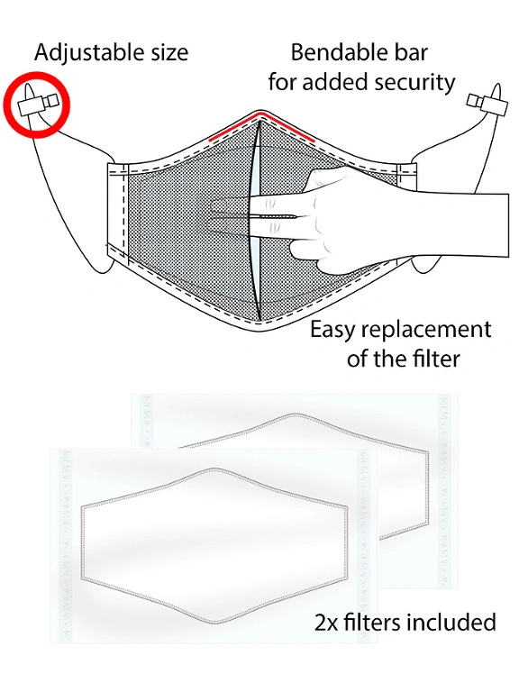 Les deux filtres D12 sont hygi?niques, pratiques et lavables, et consistent en six couches de mati?re. Les filtres peuvent ?tre lav?s dix fois avant d’?tre chang?s. Masque et filtres doivent ?tre lav?s s?par?ment.
