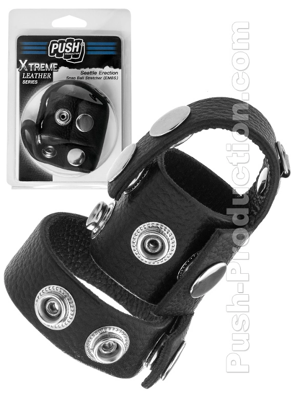 Le cockring Seattle Erection Snap baptis? EMBS (Erection Maker & Ball Stretcher, favorise l’?rection et ?tire les testicules) de la gamme Push Xtreme Leather d?livre d?intenses sensations sexuelles.