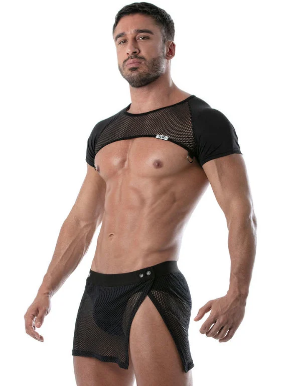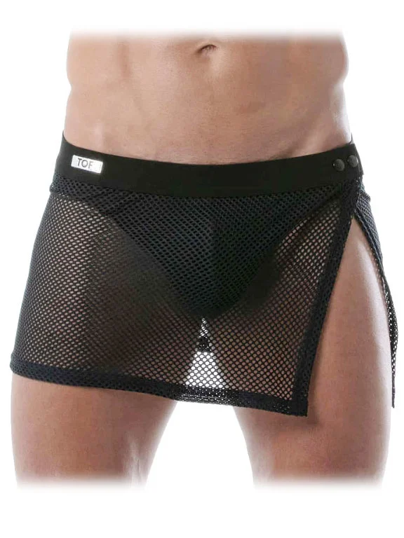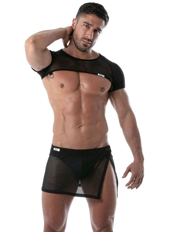 Cette jupe masculine noire Circuit Mesh de TOF Paris est incroyablement tendance, fun et sexy pour votre visite aux bains ou en club.